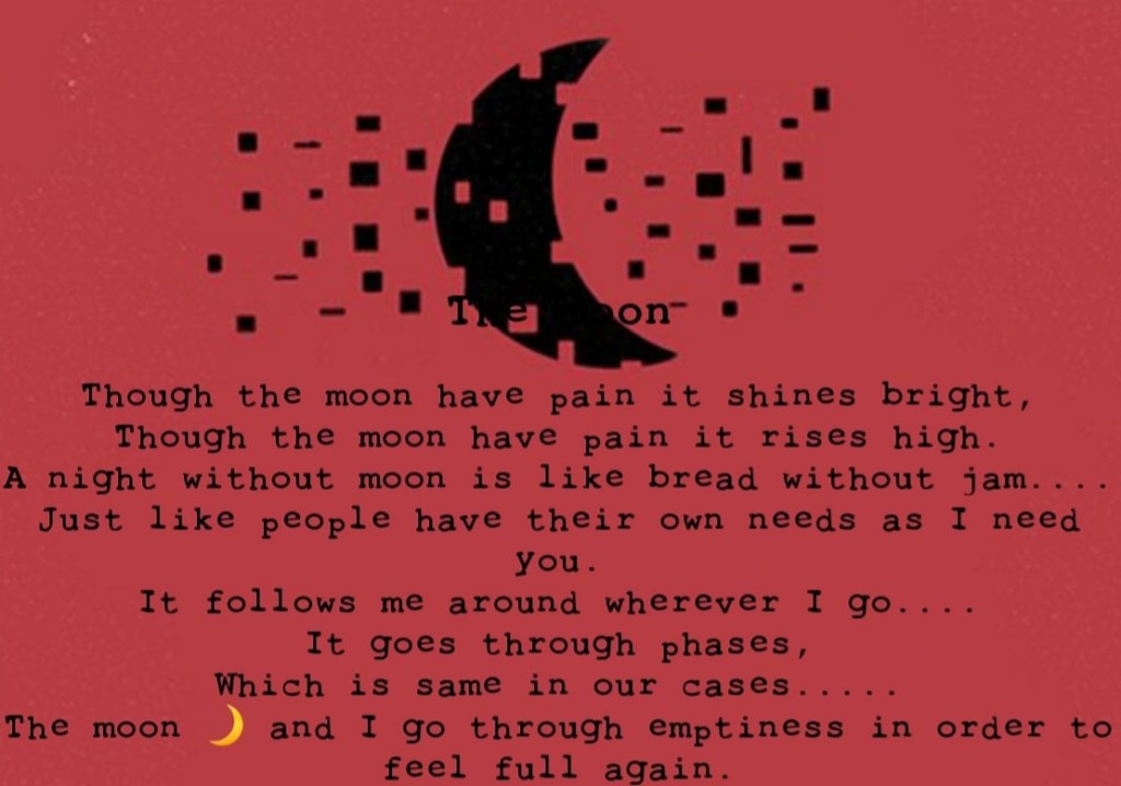 “The Moon” was the first poem I wrote. I wrote this poem in 2020, during the pandemic. At that time I did a lot of stargazing. As I take a look at the night sky, someday the moon looks big & bright and somedays there are moonless nights. As I look at the moonless sky I felt empty… But as I felt this emptiness I realized that in order to feel full you must go through emptiness.